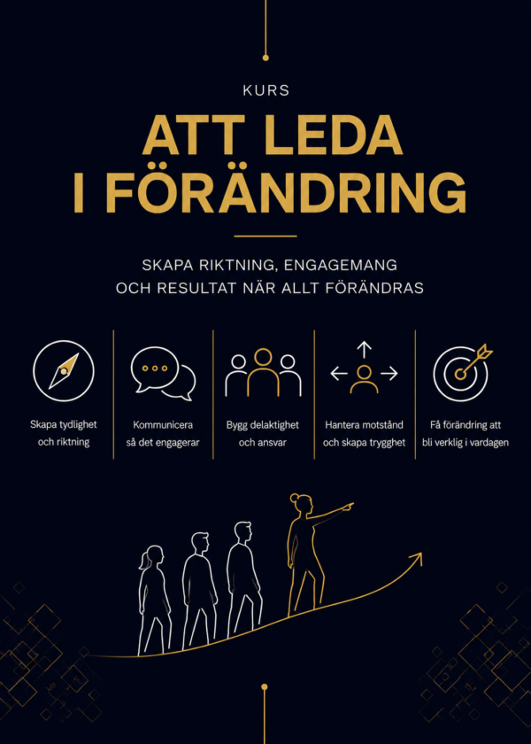 Kursen fokuserar på det som ofta avgör om en förändring lyckas eller misslyckas: ledarskapet i vardagen. Hur du kommunicerar när svaren inte är självklara. Hur du bygger tillit i osäkerhet. Och hur du får människor att vilja vara en del av förändringen, inte motarbeta den.